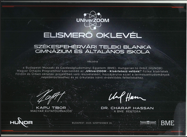 Elismerő oklevél a HUNOR Magyar Űrhajós Program és az “UNIverZOOM – Kísérletezz velünk!” fizikai kísérletek Földön és Űrben projektben való sikeres részvételünkért!
