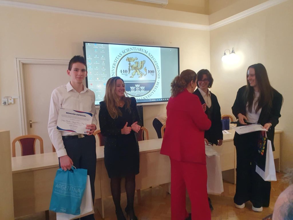 2025.02.28.-án a „Deportes y juegos en el mundo prehispánico”, azaz Sportok és játékok a prehispán világban című országos spanyol kulturális versenyen számos csapat közül iskolánk csapata: Fülöp Boróka, Paizs Panna, Tihanyi Ábel a 11.B osztály tanulói különdíjban részesültek.